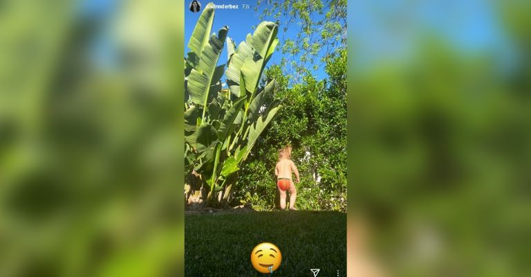 A través de sus historias, Aislinn publicó una foto en donde la niña de 2 años aparece de espaldas y desnuda mientras juega en el jardín.