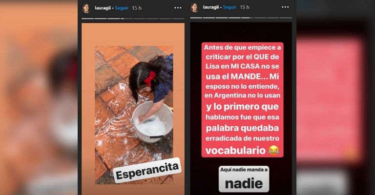 Antes de que empiece a criticar por el ‘que’ de Lisa, en mi casa no se usa el ‘mande’… Mi esposo no lo entiende, en Argentina no lo usan y lo primero que hablamos fue que esa palabra quedaba erradicada de nuestro vocabulario. Aquí nadie manda a nadie”, escribió Laura G en otra de sus Historias de Instagram.