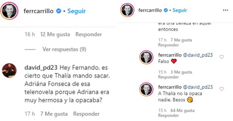 La imagen del recuerdo generó numerosos comentarios e incluso Carrillo fue cuestionado por sus fans sobre si alguna vez mantuvoun romancecon la artista. Uno de esos mensajes fue el de un internauta que cuestionó al actor sobre el rumor de Thalía y quien actuara de su hermana en el melodrama,Adriana Fonseca.