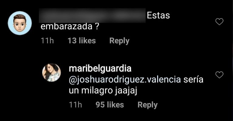 ¿Estás embarazada?”, cuestionó el seguidor, a lo que Maribel sin dudarlo y con mucho humor, le respondió: Sería un milagro”.