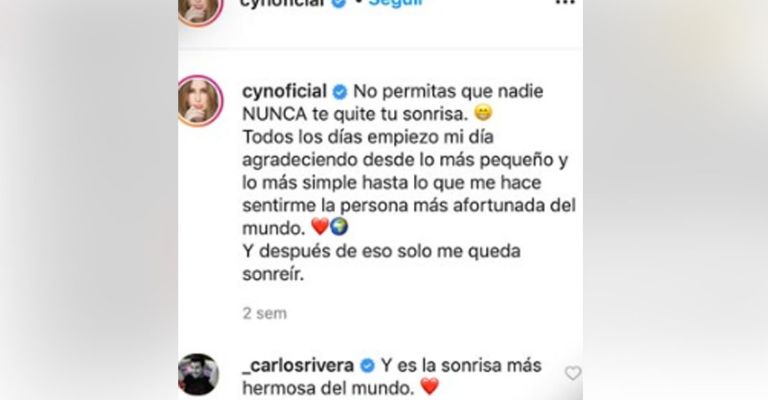 La primera se dio en la cuenta de Cynthia, quien publicó una imagen de ella con la leyenda, “No dejes que nadie te robe tu sonrisa”, palabras que fueron respondidas por el originario de Tlaxcala, quien le dejó un hermosos mensaje.