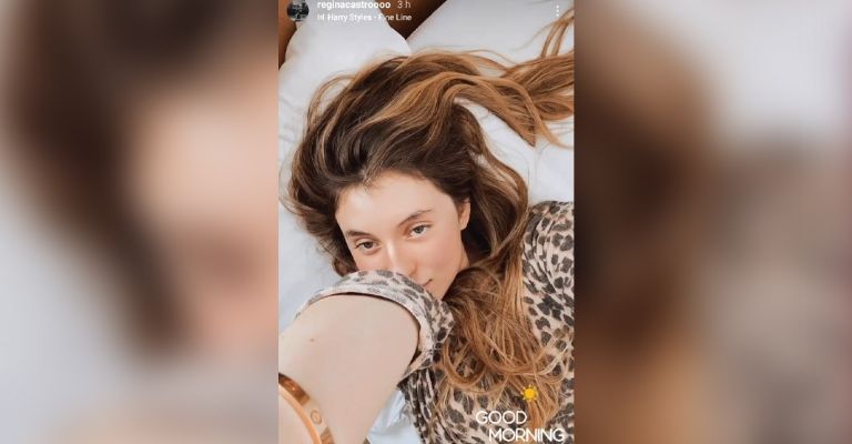 Regina aparece aún recostada sobre su cama y permite ver su belleza sin ningún tipo de arreglo, además de lucir una blusa con estampada de animal print de leopardo y el cabello desarreglado.