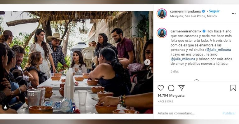 Hace un año que nos casamos y nada me hace más feliz que estar a tu lado. A través de la comida es que se enamora a las personas y mi chulita cayó en mis brazos. Te amo y brindo por más años de amor y platillos nuevos a tú lado”, escribió la potosina.