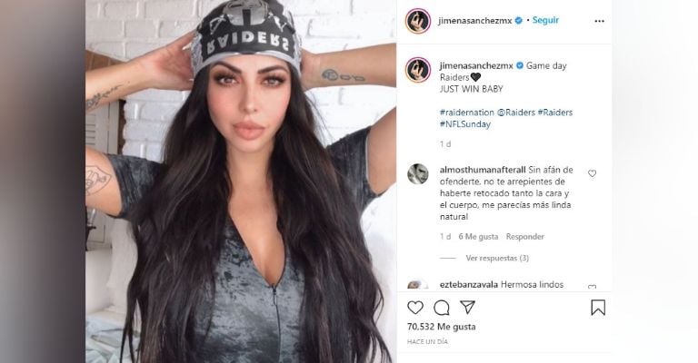Ciudad de México.-La presentadora deportivaJimena Sánchez, por medio de su cuenta deInstagramcompartió una llamativa imagen en la cual se le pudo ver apoyando a los Raiders.