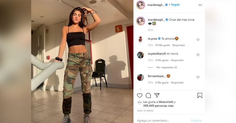 Mar de Regil posó de lo más coqueta y con un espectacular atuendo compuesto por pantalón de estampado militar, crop top de color negro, tenis y el cabello lacio y suelto, además de lucir un maquillaje que resaltó su belleza.
