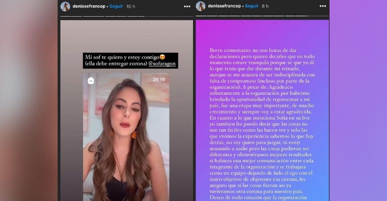 Ciudad de México.-La modeloDenisse Franco, mostró su apoyo haciaSofía Aragón, quien decidió romper el silencio sobre el trato que recibió por parte deLupita Jones,a quien acusa de no apoyarla.