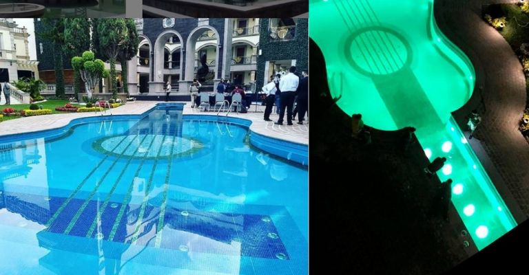 Respecto al diseño, se pudo observar a través de fotografías que circulan en internet de la Mansión Solís, que el hotel boutique cuenta con bar, restaurante, spa, gimnasio una fuente en forma de nota musical y una enorme alberca en forma de guitarra que hace más único el recinto.