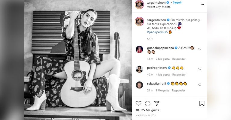 La conocida ‘Sargento León’ se dejó ver posando sentada sobre una mesa mientras tiene una guitarra entre sus piernas. Ella luce botines de tacón en color blanco, unirresistible vestido, maquillaje que la hizo lucir hermosa y el cabello sujeto en una coleta de caballo.