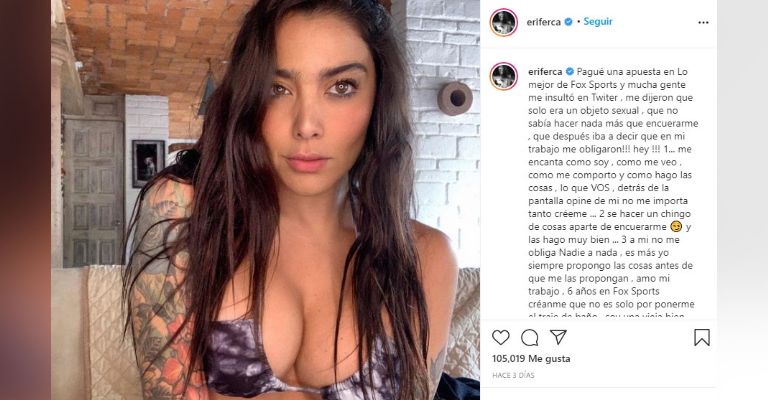 Pagué una apuesta en Lo mejor de Fox Sports y mucha gente me insultó en Twiter, me dijeron que solo era un objeto sexual, que no sabía hacer nada más que encuerarme, que después iba a decir que en mi trabajo me obligaron”, escribió.