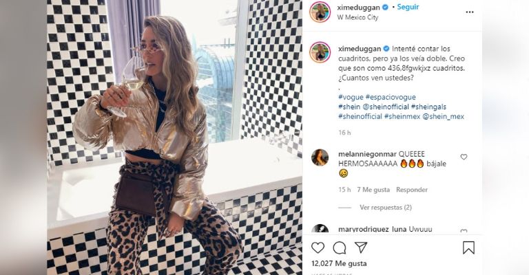 Ximena demostró su gran estilo y gusto para vestir al posar mientras luce un pantalón con estampado de leopardo, botas de color negro, croptop negro, una brillante chamarrada dorada, distintos accesorios como lentes y bolso, además de que posó con una copa de vino en mano.