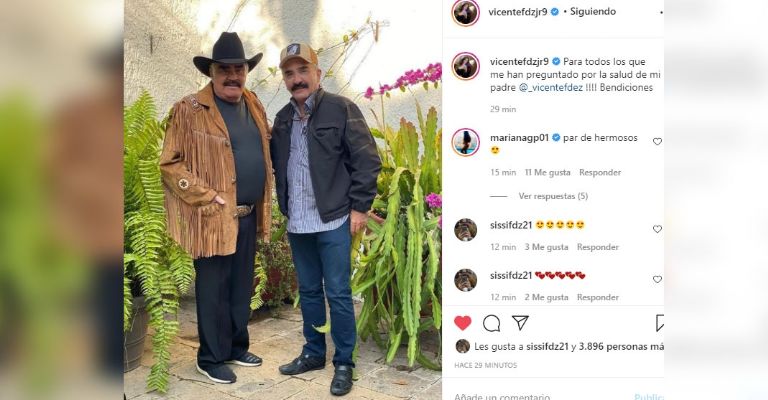 Mientras que se ve a los dos Vicente’s bastante sonrientes y muy bien cuidados por lo que sus incondicionales fans obtuvieron gran tranquilidad al saber que solo era una fotografía para presumir lo bien que permanece a sus80 añosel cantante de música ranchera.