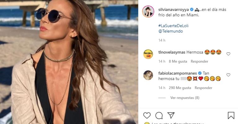 Silvia posó sentada en la arena mientras lleva un revelador bañador de color negro, un kimono color beige, lentes para cubrirse del sol, algunos accesorios dorados, el cabello con ligeros risos y un maquillaje que resaltó su belleza.