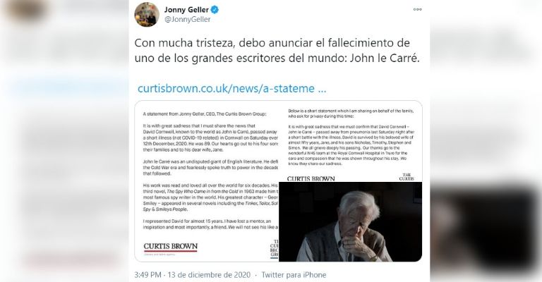 Es con gran tristeza que debo compartir la noticia de que David Cornwell, conocido en el mundo como John Le Carré, falleció después de una breve enfermedad (no relacionada con Covid-19) enCornwallel sábado 12 de diciembre de 2020 por la noche. 89. Nuestros corazones están con sus cuatro hijos, sus familias y su querida esposa, Jane”, declaró Geller.