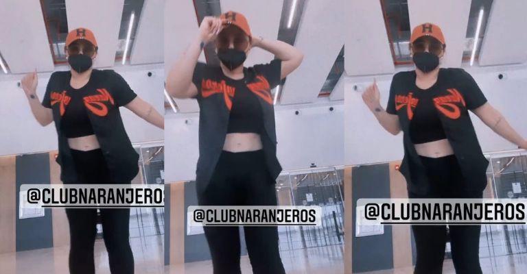 ‘Gomita’ se grabó poco antes de abordar su avión y se dejó ver mostrando sus mejores pasos al ritmo del exitoso tema de La Brissa,La colaless, mientras lleva leggings de color negro, un top que permitió ver suabdomen planoy además la jersey de Naranjeros.