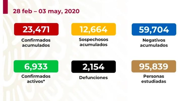 Ciudad de México.-Este domingo 3 de mayo, la Secretaría de Salud México informó que se registran un total de23 mil 471de casos confirmados de coronavirus en el país.