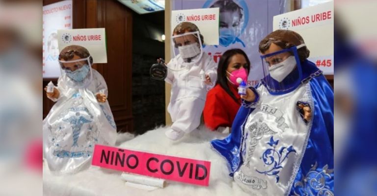 Siempre ha existido el Niño Dios doctor y nosotros por apoyo a que la gente se ponga el cubrebocas, la careta, hicimos esto. Hicimos esta vestimenta que crearon mi suegro y mi esposa para concienciar a la gente para que no se haga más largo esto de la pandemia”, dijo Emanuel González, encargado de Niños Uribe.