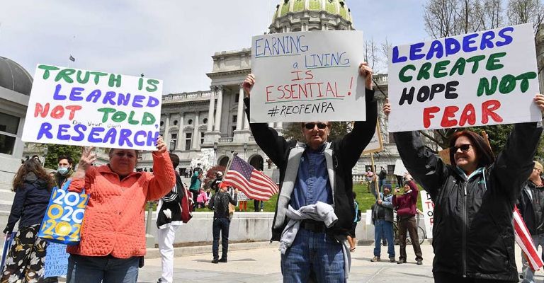 Camiones pintados con las leyendas “Trabajo, no ayuda estatal” y “¡Cuarentena no es libertad!” circularon por Harrisburg, mientras representantes republicanos alentaban a los manifestantes en las escaleras del Palacio legislativo estatal.