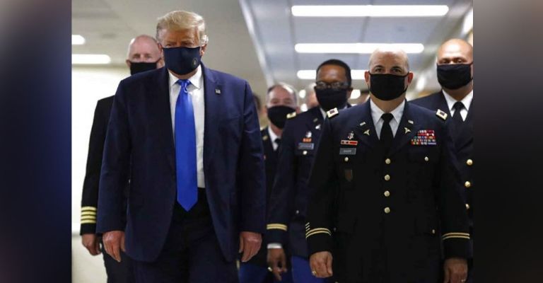 Estados Unidos.-Este sábado, el presidente deEstados Unidos,Donald Trump, fue captado por la prensa utilizando una mascarilla durante una visita a un hospital militar, luego de que asegurara que nunca lo portaría.