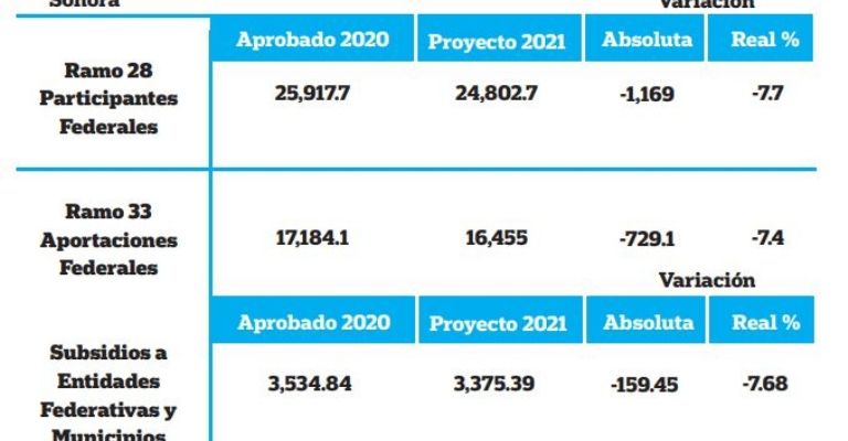ParaSonora, en el ramo33 por Aportaciones Federalespara el siguiente año se recibiría 16 mil 445 millones de pesos, cuando en 2020 se obtuvo 17 mil 184.1 millones, es decir, 729.1 millones menos.