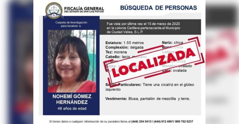 Ciudad Valles, San luis Potosí.-Nohemí Gómez Hernández, de 48 años de edad, fue vista por última vez el 15 de marzo en la calleTancanhuitz, coloniaLa Pimienta, del municipio deCiudad Valles,San Luis Potosí.
