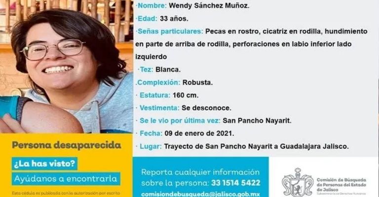 Guadalajara, Jalisco.- Luego de no saber de su paradero, losfamiliaresreportaron la desaparición deWendy SánchezMuñoz, de 33 años, de quien se desconoce desde el pasado 9 de enero.