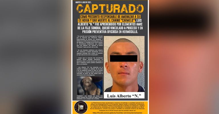 Hermosillo, Sonora.-Vinculado a proceso y en prisión preventiva quedóLuis Alberto‘N’ quien fue aprehendido al figurar como el presunto responsable de losdelitosde amenazas cumplidas y por la muerte de un animal por actos demaltratoo crueldad en concurso real de delitos, ambos delitos en perjuicio deSarahíy el canino llamado ‘Carmelo‘.