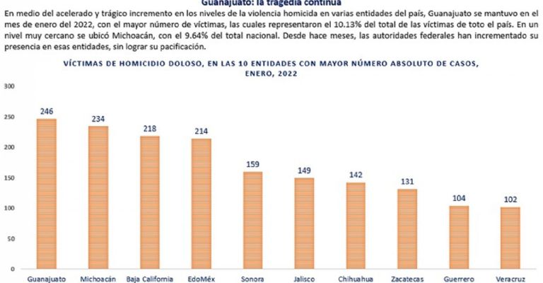 Cabe mencionar que el estado de Guanajuato lleva años en focos rojos, al convertirse en uno de los estados con más homicidios, según datos de algunos medios locales, mismos que argumentan que en el mes de enero hubo un total de 2 mil 427 víctimas.