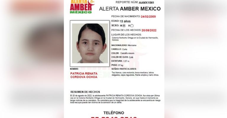 Hermosillo, Sonora.-Tras 13 días de búsqueda por todo el estado de Sonora, de la joven,Patricia Renata Córdova Ochoa, de 13 años de edad, quien fue vista por última vez el pasado 20 de agosto en la ciudad deHermosillo, se activó unaAlerta Ambernacional por lo que durante todo este tiempo las autoridades han estado trabajando sin obtener resultados positivos.