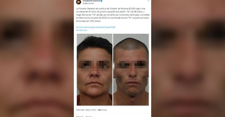Hermosillo, Sonora.-LaFiscalía General de Justicia del Estado de Sonora(FGJE) logró una condena de 27 años de prisión paraDinora Judith‘N’, de 46 años, yHugo Fernando‘N’, de 28, por el delito de homicidio calificado cometido enHermosilloen junio de 2022 en contra de Arturo ‘N’, a quien privaron de la vida por 100 pesos.