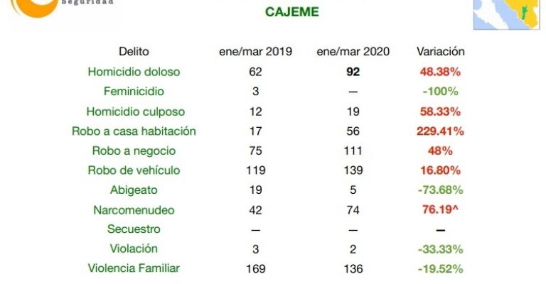 Ciudad Obregón, Sonora.- Durante los primero tres meses del 2020 en Cajeme se han registrado un total de92 carpetasde investigación porhomicidio doloso, lo que presenta un aumento de48.4 por cientorespecto al mismo periodo del año anterior, esto de acuerdo a datos del Secretariado Ejecutivo del Sistema Nacional de Seguridad Pública (Sensp).