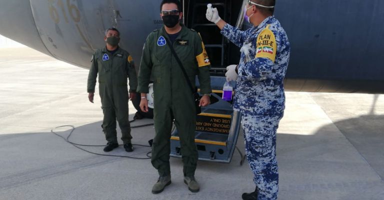 Hermosillo, Sonora.-Este jueves 14 de mayo, personal de la Secretaría de la Defensa Nacional, a bordo de una aeronave Hércules C-130 perteneciente a la Fuerza Aérea Mexicana, provenientes de la Ciudad de México, arribó a las instalaciones de la Base Aérea Militar No. 18 en Hermosillo,Sonora.