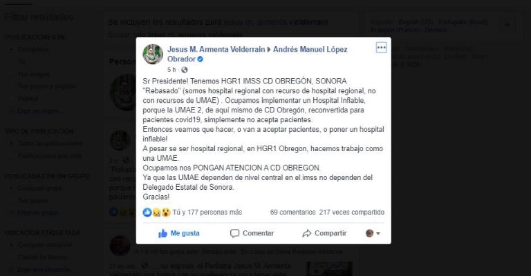 Ciudad Obregón, Sonora.- A través de una publicación deFacebookcompartida en el perfil deAndrés Manuel López Obradorel médico pediatra hizo un llamado urgente debido a que la situación del hospitalHGR1 IMSS en Ciudad Obregónse encuentra “rebasado” ante la crisis por la pandemia delcoronavirus.