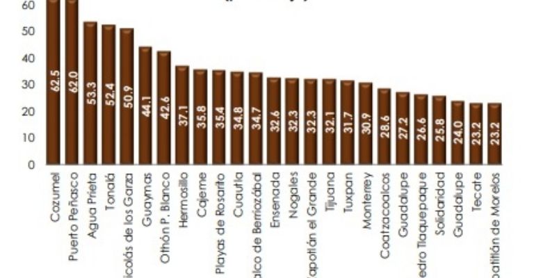 Otro dato interesante del estudio es que de los 25 municipios más endeudados per cápita , 6 son de Sonora, en ellos se encuentra; Puerto Peñasco, lugar 2; Agua Prieta, lugar 3; Guaymas, lugar 5; Hermosillo, lugar 7; Nogales, lugar 8; y Cajeme, lugar 14. En cuanto a deuda municipal son 3 los municipios de Sonora que aparecen Hermosillo con una obligación de 1,861.7 millones de pesos, Cajeme con 665.8 y Nogales con 497.3.