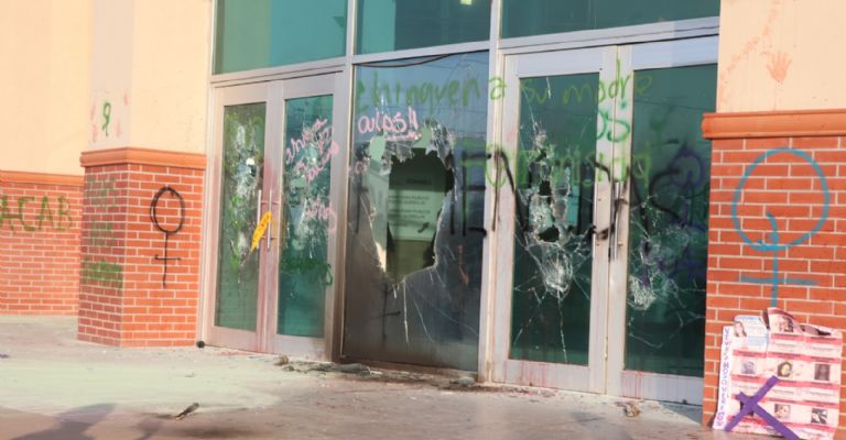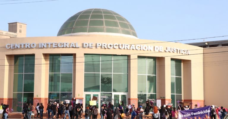 El recorrido continuó rumbo alCentro de Procuración de Justicia del Estado de Sonora, donde lo que era hasta en ese momento una marcha pacífica, se salió de control. Manifestantes con el rostro cubierto, portando varillas, marros y bates de beisbol, quebraron cristales del edificio, plasmaron diversas pintas y prendieron fuego en la entrada principal; acto seguido las manifestantes rompieron filas abandonando el lugar por diferentes rutas.