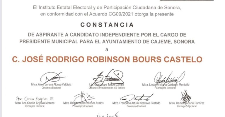 Cabe señalar que uno de los requisitos para el puesto, de manera independiente era la recolección de 10 mil firmas. En el documento fechado el 3 de enero de 2021, el IEE Sonora, hace constar la legalidad de la candidatura.