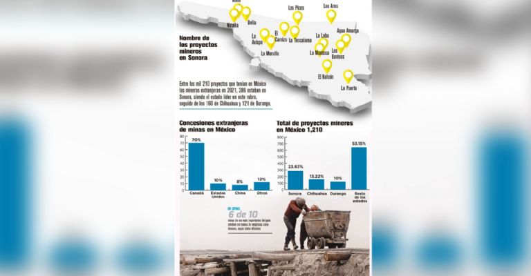 En 2021, seis de las 10 minas de oro más importantes del país estaban en manos de empresas canadienses, según datos oficiales. Con más de 70 mil kilogramos de anuales del metal más valorado del mundo, que representan 64 mil millones de pesos, México es el noveno productor a escala mundial. De dicha cifra, 35 mil millones de pesos se estarían yendo a empresas canadienses comoTorex Gold,Agnico EagleMinesyEquinox Goldy el resto se distribuye entre las estadounidenses comoCoeur MiningyNewmonty las mexicanas.