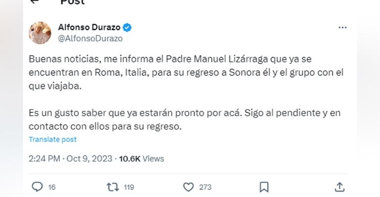 Me informa el padre Manuel Lizárraga que ya se encuentran en Roma, Italia, para su regreso a Sonora él y el grupo con el que viajaba. Es un gusto saber que ya estarán pronto por acá”, escribió.