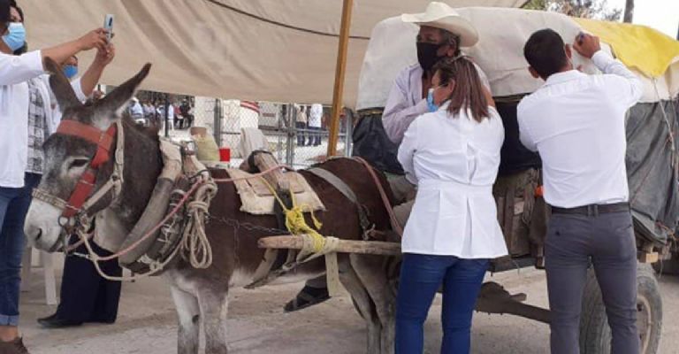 Burgos, Tamaulipas.- Debido a que lasvacunascontraCovid-19llegaron al municipio de Burgos, en Tamaulipas, los adultosmayoreshan comenzado a ubicar sus módulos de vacunación más cercanos. Algunos con dificultades, peroasisten, como en el caso de Don Gonzalo, quien llegó en sucarreta, acompañado de suburro.